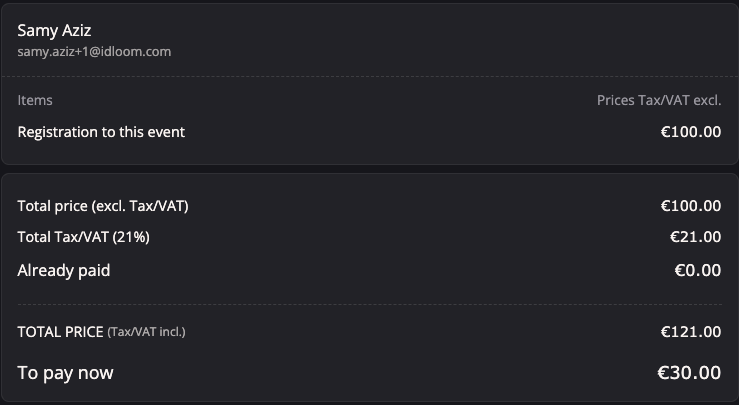 Once the balance is paid, the invoice is automatically updated to reflect the full payment, giving both organizers and attendees a complete view of the total amount paid and outstanding.